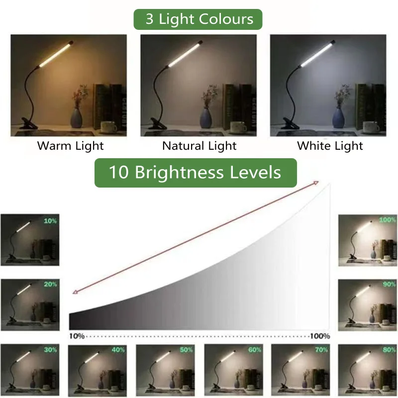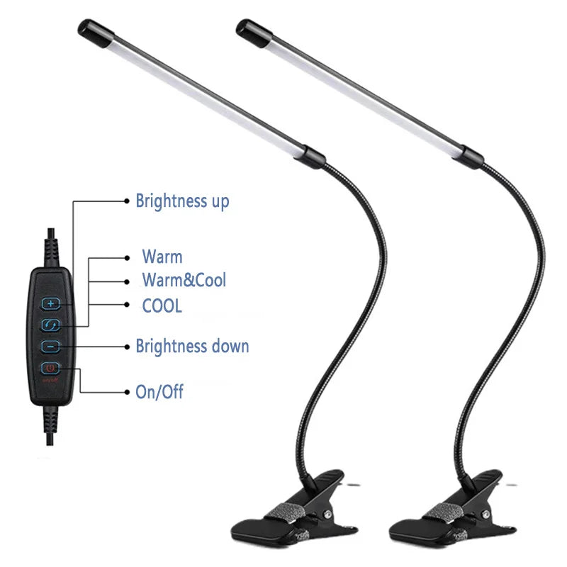 LED Clip-on Desk Lamp Eye Protection 360° Steering 3 Light Colours 10 Brightnesses Infinitely Dimmable 2M Cable Length 5W USB Po